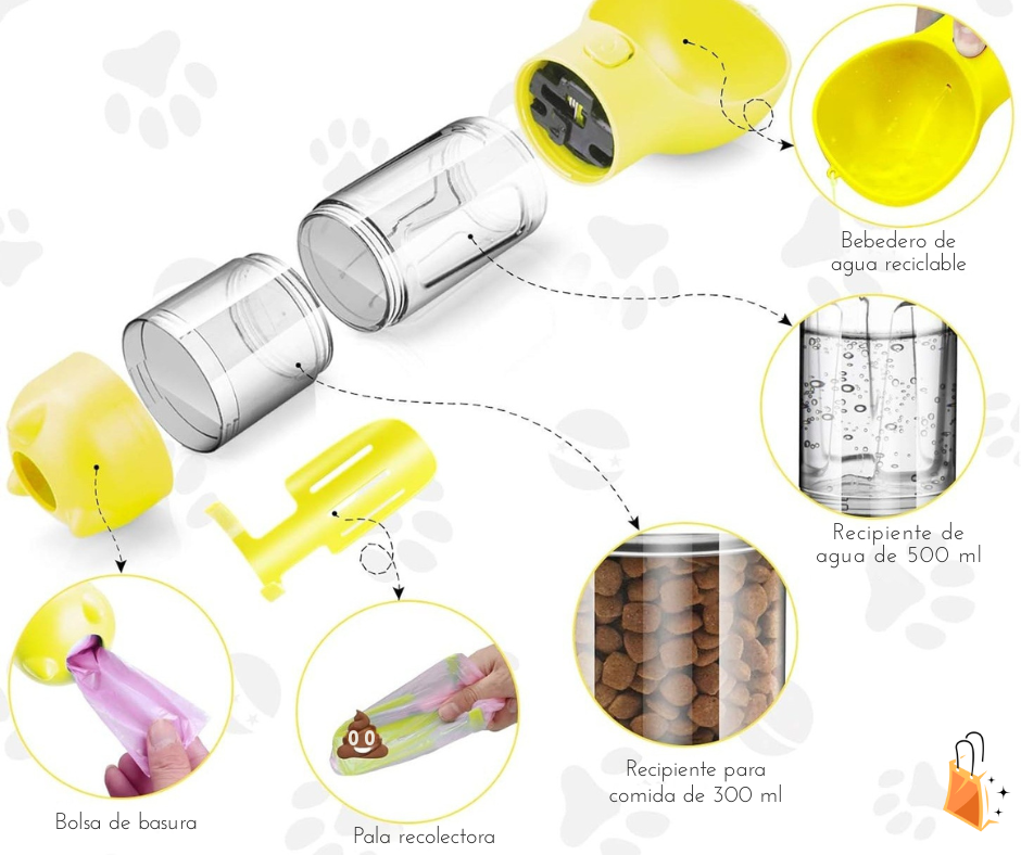 - Recipiente polifuncional (botella de comida, agua, plato, pala y bolsa para excremento)